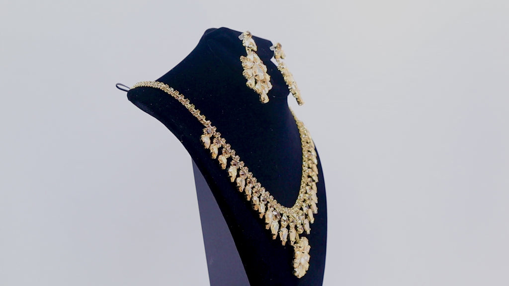 Elevate your elegance with this exquisite gold necklace and earring set. Featuring dazzling gold-tone stones and intricate detailing, this set is designed to add a touch of sophistication to any outfit. Perfect for weddings, proms, and other formal events, this jewelry set will ensure you shine bright and make a lasting impression.