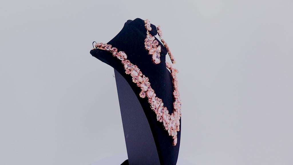 Elevate your elegance with this enchanting pink crystal necklace and earring set. The set features radiant pink crystals, intricately designed to add a touch of glamour to your ensemble. Perfect for formal events, weddings, and special occasions, this set will make you stand out with its luxurious and sophisticated appeal.